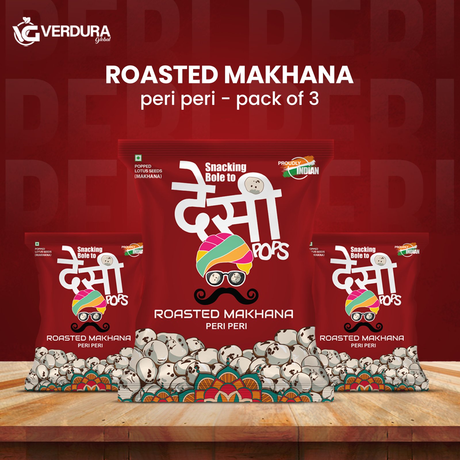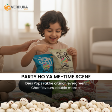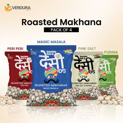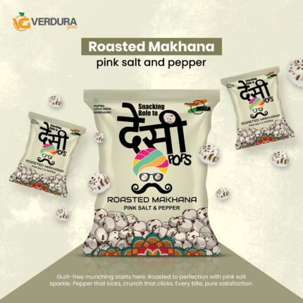 Verdura Global brings you Desi Pops Roasted Flavored Makhana – a light, crunchy and delicious healthy snack made from premium fox nuts. Carefully roasted to perfection, our roasted makhana delivers the perfect balance of taste and nutrition in every bite. Whether you love the zing of peri peri makhana, the refreshing twist of pudina makhana, or the classic taste of Salt and Pepper makhana, there’s a flavor for every craving.