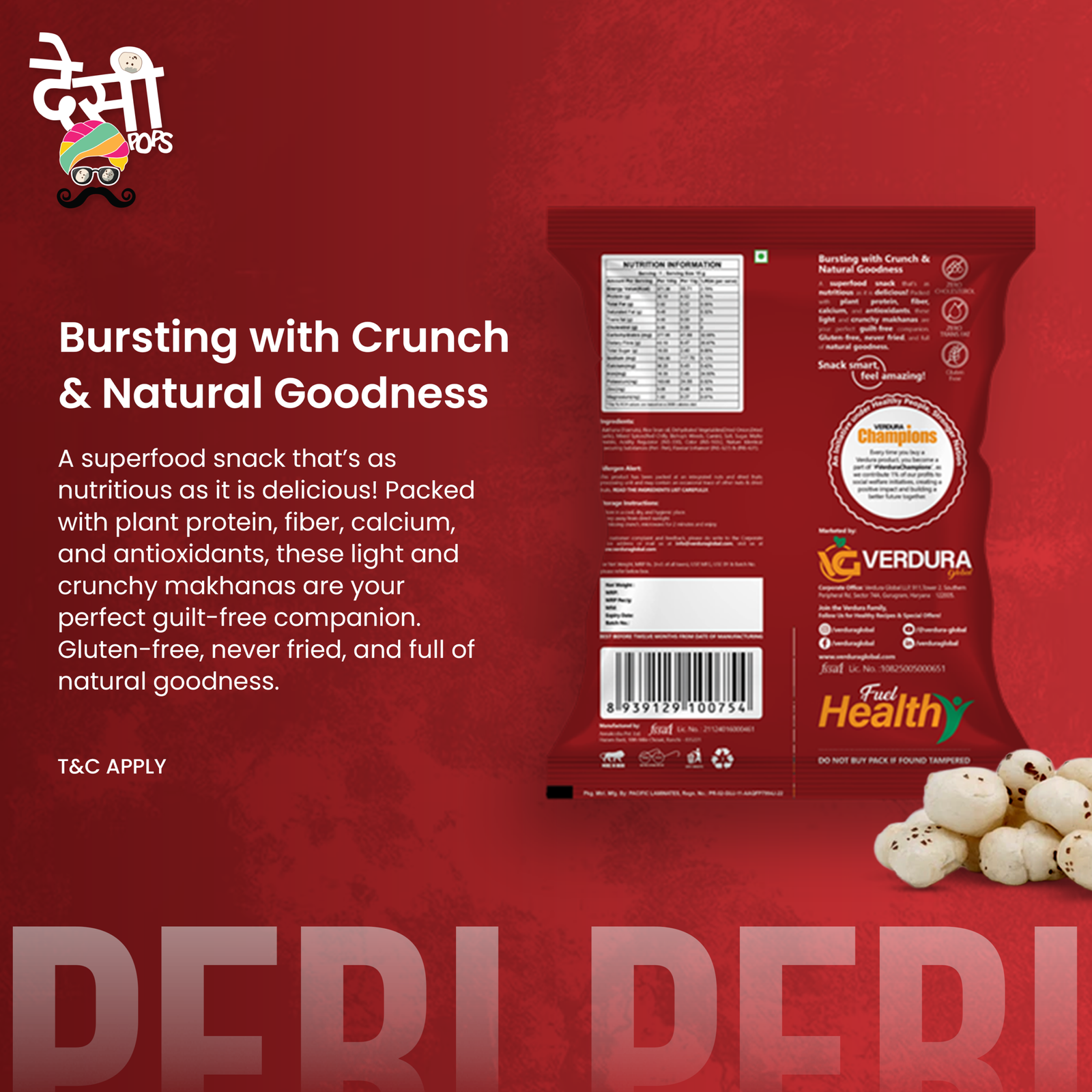 Our flavored makhana is gluten free and cholesterol free, making it an ideal guilt-free namkeen for tea-time, office snacking, travel, or mid-day hunger pangs. These puffed lotus seeds are rich in antioxidants and naturally light, offering a smart alternative to fried snacks. Packed in a convenient 25g pack for freshness and portion control, Verdura Global Desi Pops makhana is perfect for kids and adults alike. Enjoy a wholesome, crunchy snack that combines bold taste with better-for-you ingredients.