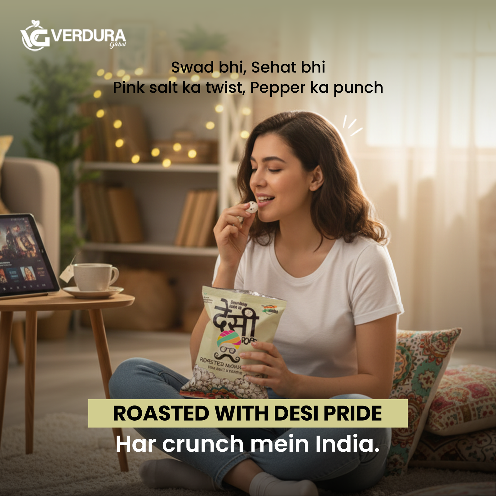 Verdura Global brings you Desi Pops Roasted Flavored Makhana – a light, crunchy and delicious healthy snack made from premium fox nuts. Carefully roasted to perfection, our roasted makhana delivers the perfect balance of taste and nutrition in every bite. Whether you love the zing of peri peri makhana, the refreshing twist of pudina makhana, or the classic taste of Salt and Pepper makhana, there’s a flavor for every craving.