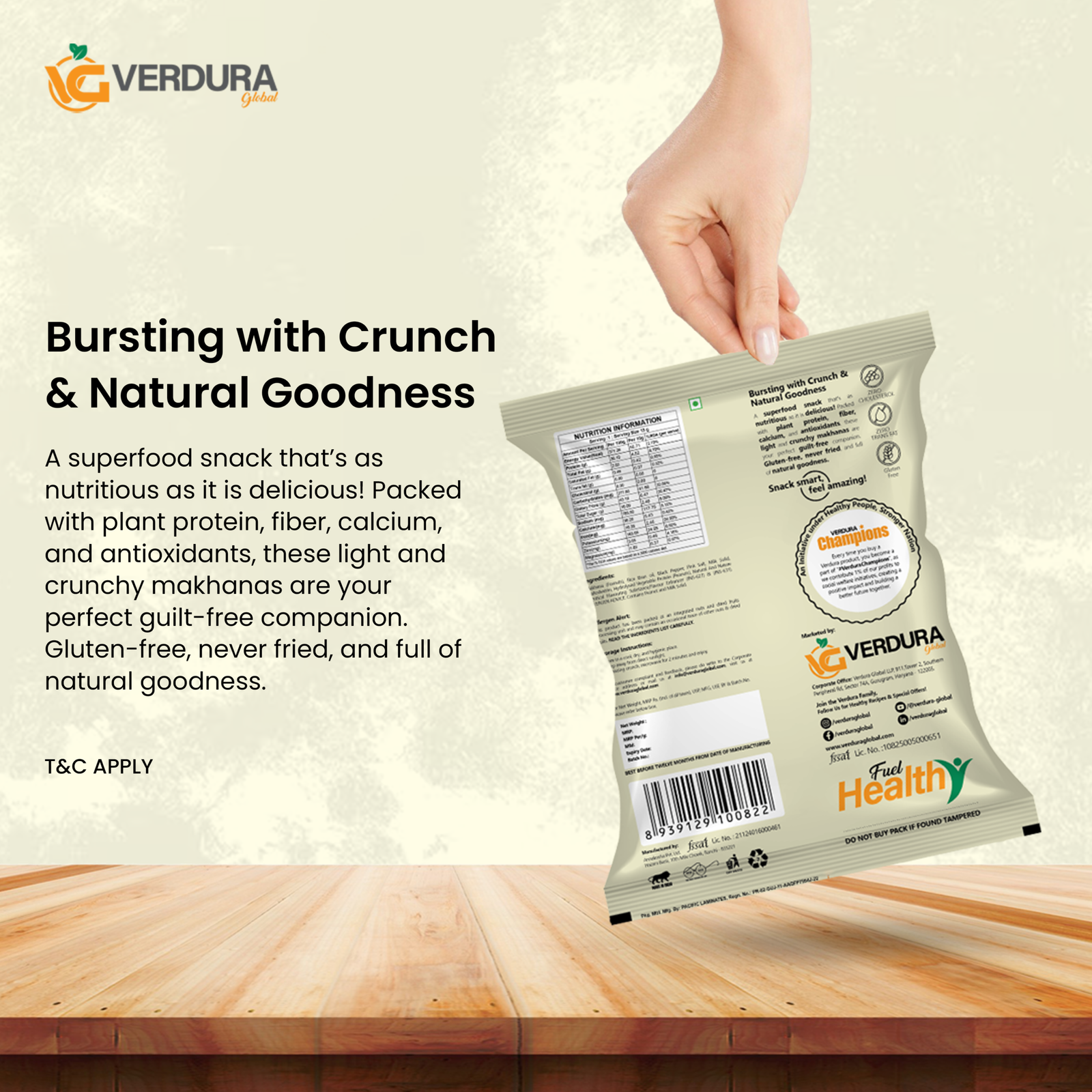 Our flavored makhana is gluten free and cholesterol free, making it an ideal guilt-free namkeen for tea-time, office snacking, travel, or mid-day hunger pangs. These puffed lotus seeds are rich in antioxidants and naturally light, offering a smart alternative to fried snacks. Packed in a convenient 25g pack for freshness and portion control, Verdura Global Desi Pops makhana is perfect for kids and adults alike. Enjoy a wholesome, crunchy snack that combines bold taste with better-for-you ingredients.